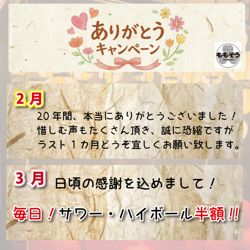 皆様、長い間「ももぞう 敦賀店」を支えてくださり誠にありがとうございます。